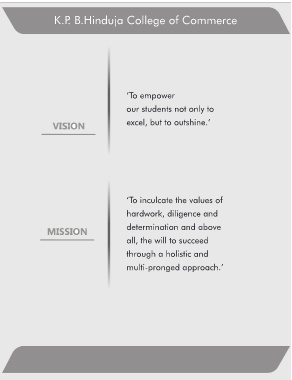 K.P. B.Hinduja College of Commerce ‘To empower our students not only to excel, but to outshine.’ ‘To inculcate the values of hardwork, diligence and determination and above all, the will to succeed through a holistic and multi-pronged approach.’