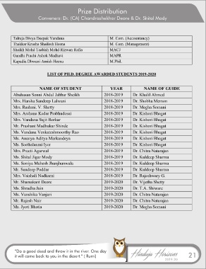 Prize Distribution Conveners: Dr. (CA) Chandrashekhar Deore & Dr. Shital Mody “Do a good deed and throw it in the river. One day it will come back to you in the desert.” ( Rumi) 21 2019-20