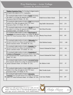 Prize Distribution – Junior College Convener: Ms. Archana Anchalwar “When our nails grow long, we cut our nails, not our ngers. Similarly, when a misunderstanding grows, cut 73 your ego, not your relationship.” (A.P.J. Abdul Kalam) 2019-20
