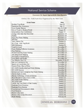 National Service Scheme Conveners: Dr. Gayatri Agarwal & Dr. Nitin Bharaskar Online/ On - field Activities Organised by the NSS Unit HINDUJA HORIZONS 2020 14 2021