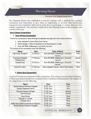 college competitions. The activities conducted by the Planning Forum in the academic year