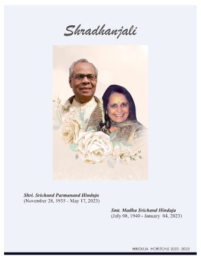 Shri. Srichand Parmanand Hinduja (November 28, 1935 - May 17, 2023) Smt. Madhu Srichand Hinduja (July 08, 1940 - January 04, 2023) HINDUJA HORIZONS 2022 -2023