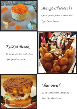 Mango Cheesecake Go-To: Spesso Goumet, Nariman Point Type: Fusion Dessert KitKat Break Go-To: London Bubble Co., Sion Type: Chocolate Dessert Churrowich Go-To: Toro Churros, Chowpatty Type: Chocolate Dessert 34 | UNLEASHED | 2019